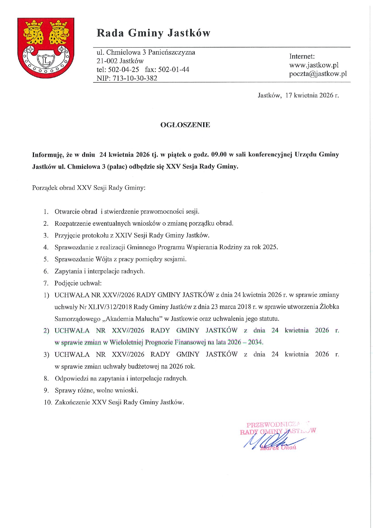 Ogłoszenie o XXV Sesji Rady Gminy
