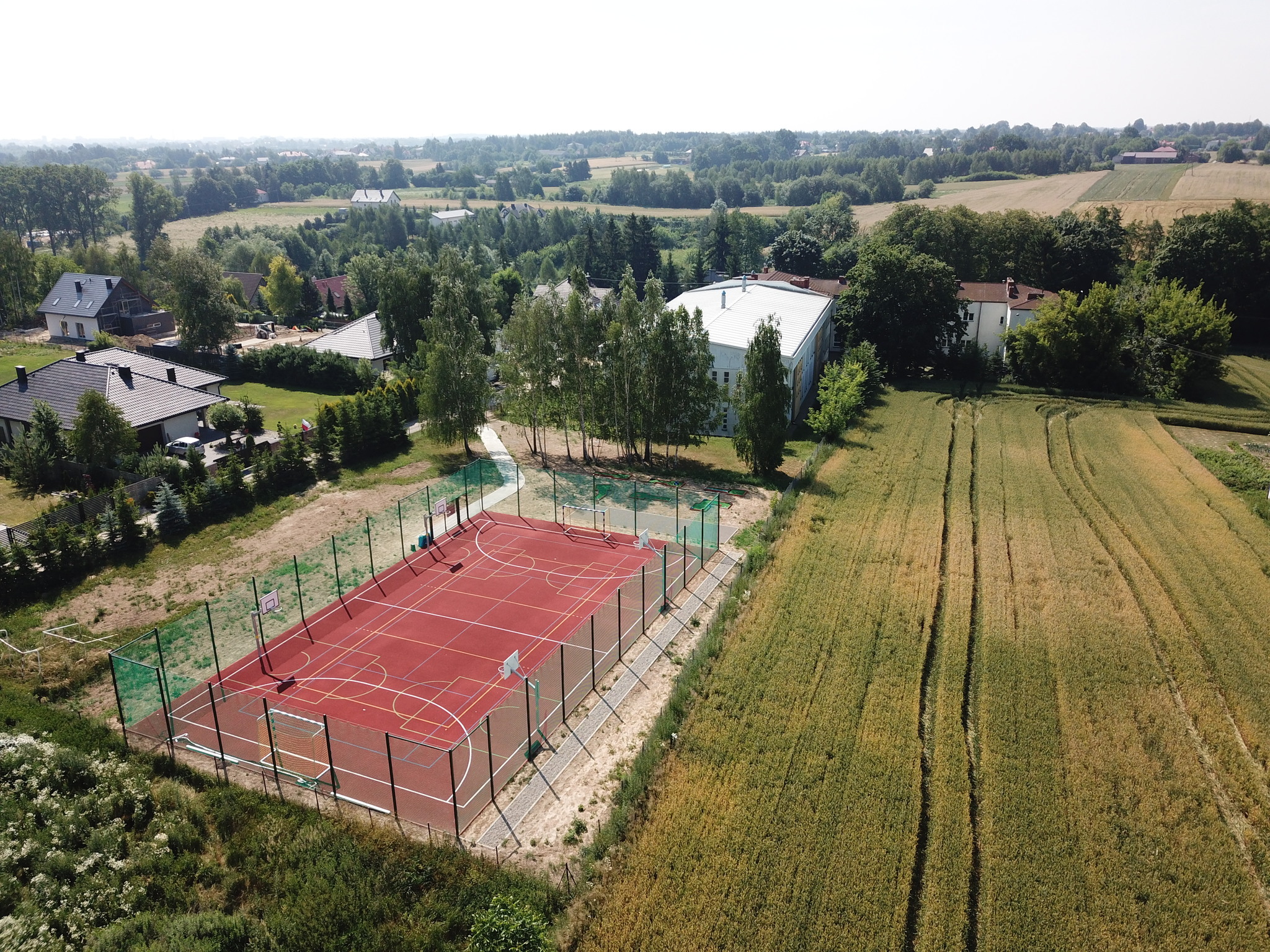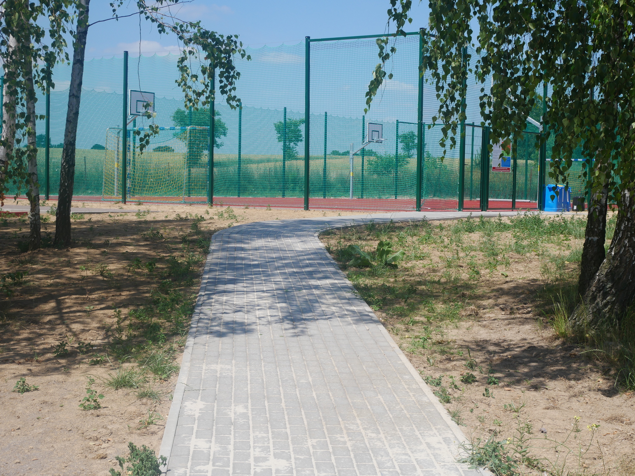 Zakres prac do wykonania: wykonanie robót ziemnych, montaż obrzeży betonowych, wykonanie podbudowy z kruszyw, wykonanie nawierzchni poliuretanowej z malowaniem linii wyznaczających pola gry, dostawa i montaż wyposażenia boisk, wykonanie ogrodzenia boiska stanowiącego jednocześnie piłkochwyty wraz z furtką i bramą wjazdową, wykonanie utwardzenia z kostki betonowej w celu ułatwienia dostępności dla osób niepełnosprawnych, dostawa pojemników do segregacji odpadów.