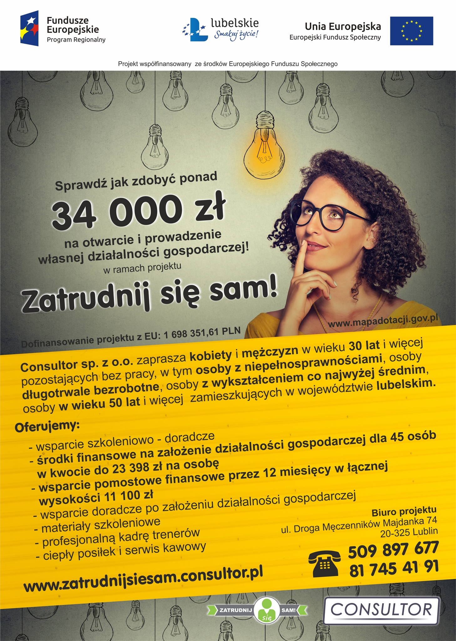 Firma CONSULTOR Sp. z o.o. w dniach 30.01.2017- 17.02.2017r. planuje rekrutacje do projektu „Zatrudnij się sam!”. Projekt prowadzony jest w ramach Regionalnego Programu Operacyjnego Województwa Lubelskiego na lata 2014-2020, Podziałania 9.3 Rozwój przedsiębiorczości . W ramach naboru wniosków przyznawane będą dotacje na uruchomienie i prowadzenie własnej działalności gospodarczej.