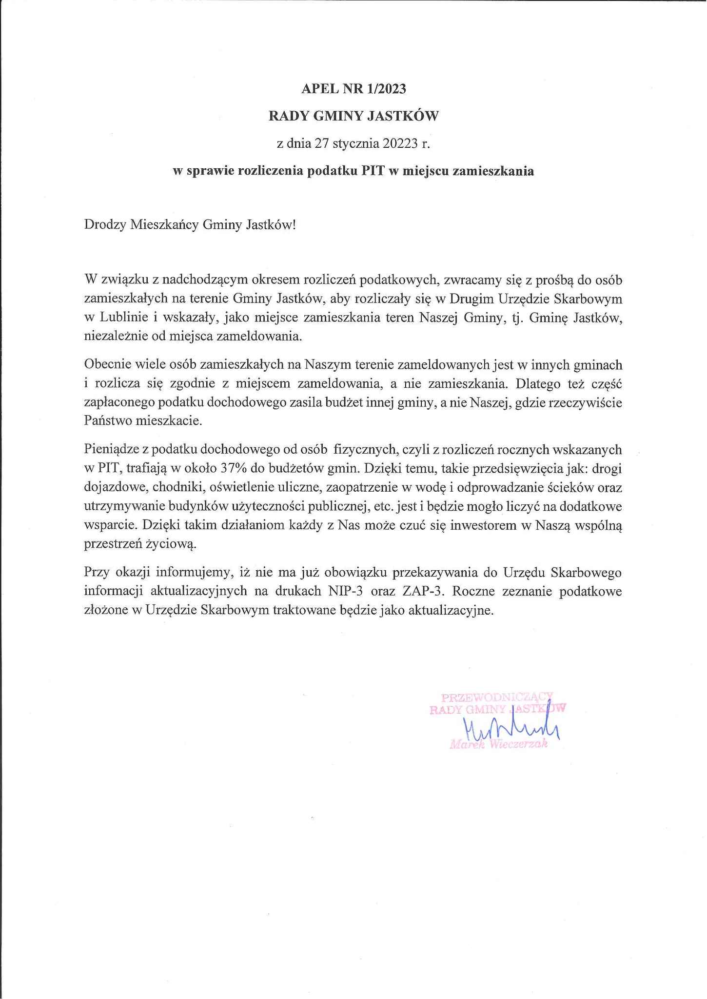 APEL NR 1/2023 RADY GMINY JASTKÓW