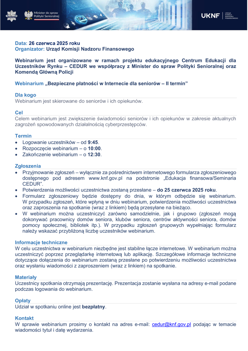 Urząd Komisji Nadzoru Finansowego zaprasza seniorów i ich opiekunów na webinarium (spotkanie online) „Bezpieczne płatności w Internecie dla seniorów – II termin” organizowane w ramach projektu Centrum Edukacji dla Uczestników Rynku – CEDUR, we współpracy z Minister ds. Polityki Senioralnej oraz Komendą Główną Policji.