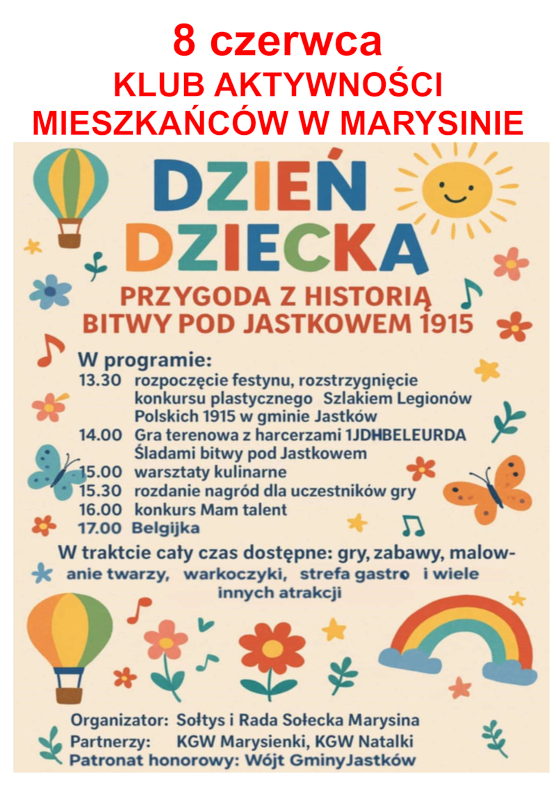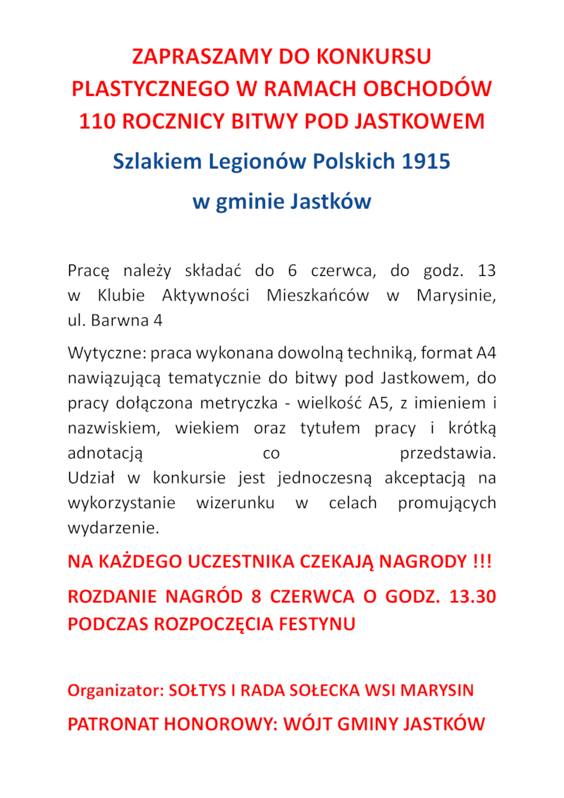 13.30 rozpoczęcie festynu, rozstrzygnięcie konkursu plastycznego Szlakiem Legionów Polskich 1915 w gminie Jastków - pracę należy składać do 6 czerwca, do godz. 15 w Klubie Aktywności Mieszkańców w Marysinie, ul. Barwna 4 (wytyczne: praca wykonana dowolną techniką, format A4 nawiązującą tematycznie do bitwy pod Jastkowem, do pracy dołączona metryczka - wielkość A5, z imieniem i nazwiskiem, wiekiem oraz tytułem pracy i krótką adnotacją co przedstawia).