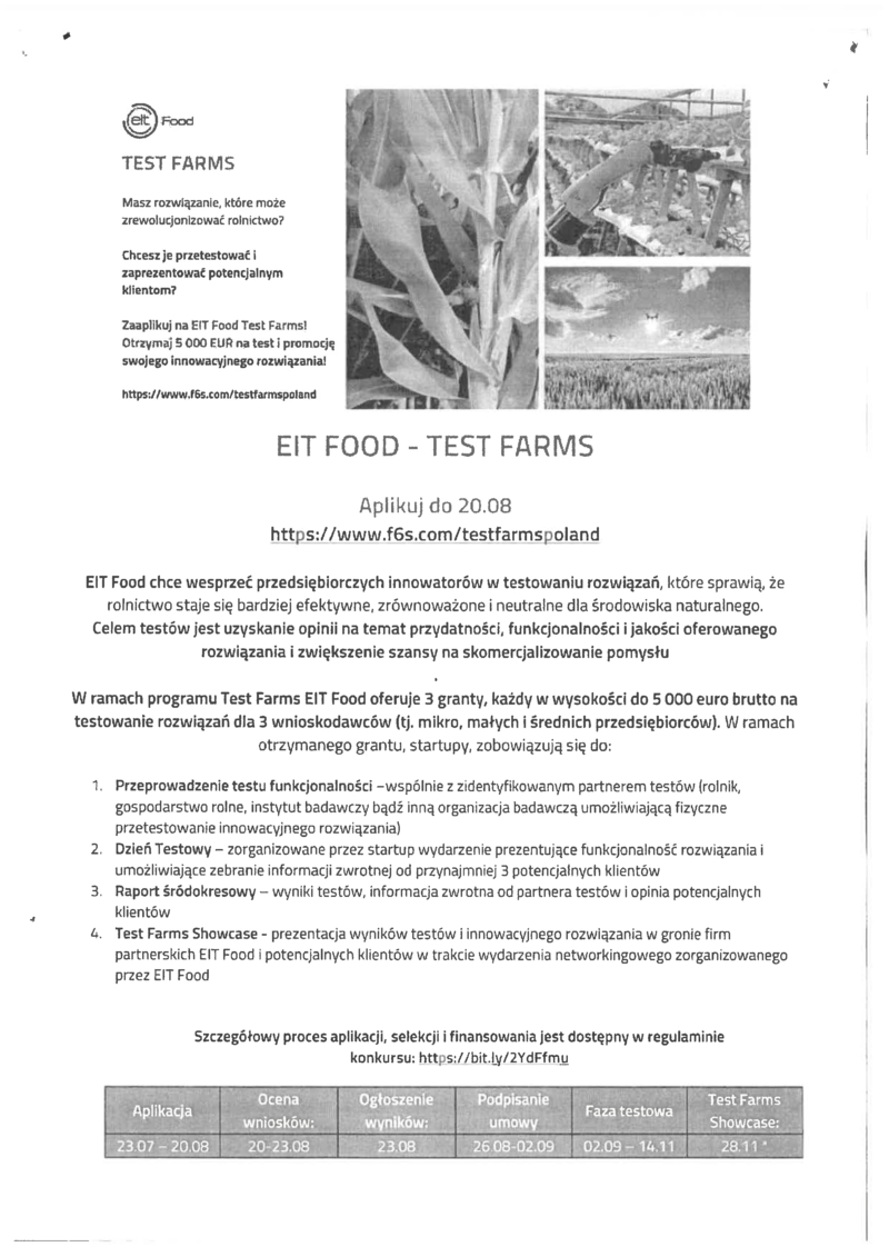 EIT Food to międzynarodowe konsorcjum firm partnerskich, instytutów badawczych, uniwersytetów i SME, które realizuje projekty innowacyjne i wspiera przedsiębiorców w sektorze rolno-spożywczym. Jednym z programów wsparcia dla startupów jest projekt TEST Farms, który umożliwia wynalazcom przetestowanie swojego rozwiązania z rolnikiem, instytutem badawczym lub uniwersytetem i zaprezentowanie swojej innowacyjnej usługi potencjalnym klientom przy wsparciu EIT Food podczas tzw. Dnia Testowego. Przedsiębiorcy mogą uzyskać granty do 5 000 EUR do wykorzystania do końca listopada 2019 roku. Aplikacje można składać online do 20 sierpnia na stronie www.f6s.com/testfarmspoland