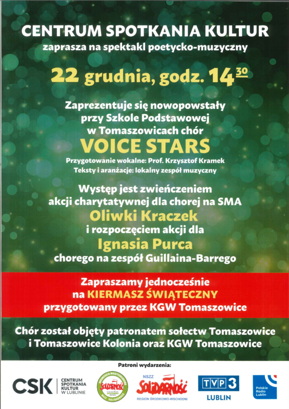 Już 22 grudnia o godzinie 14:30 w Centrum Spotkania Kultur odbędzie się spektakl poetycko-muzyczny przygotowany przez lokalny zespół muzyczny i chór dziecięcy VOICE STARS powstały przy Szkole Podstawowej w Tomaszowicach.