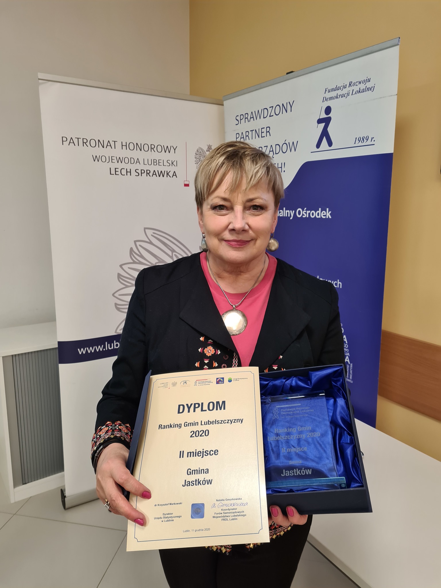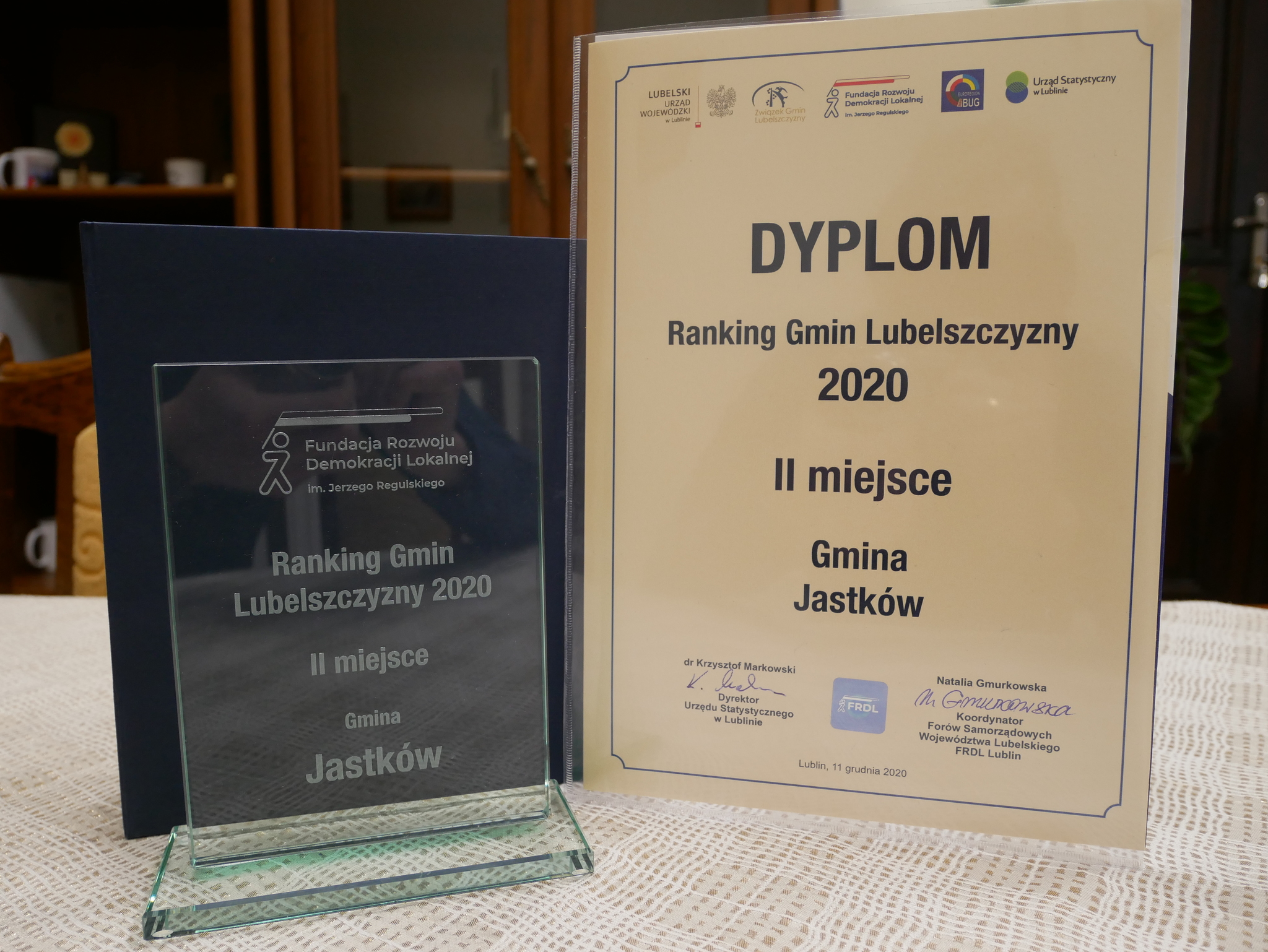 W dniu dzisiejszym - 11 grudnia 2020 r na uroczystej gali, zorganizowanej przez Fundację Rozwoju Demokracji Lokalnej Regionalny Ośrodek w Lublinie we współpracy z Urzędem Statystycznym, nastąpiło wręczenie wyróżnień dla 20 najlepszych gmin według Rankingu Gmin Lubelszczyzny. Pani Wójt Teresa Kot odebrała zaszczytne wyróżnienie dla Gminy Jastków, która uplasowała się w 2020 roku na 2 pozycji. W roku 2019 nasza gmina zajęła w tym samym rankingu miejsce 3, w 2018  miejsce 7 a w 2017 miejsce 10.Ocenie poddawane są wszystkie gminy województwa lubelskiego z wyłączeniem miast na prawach powiatu.