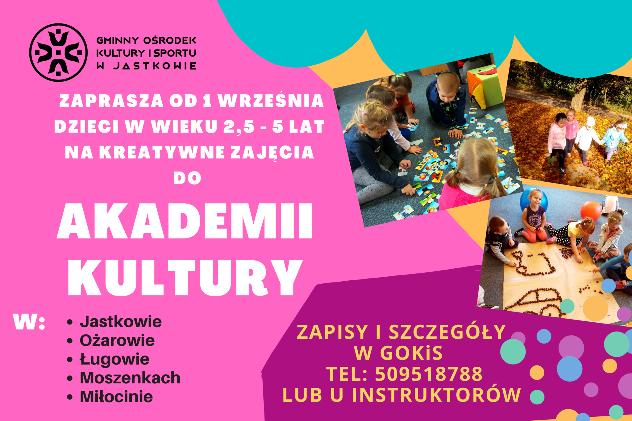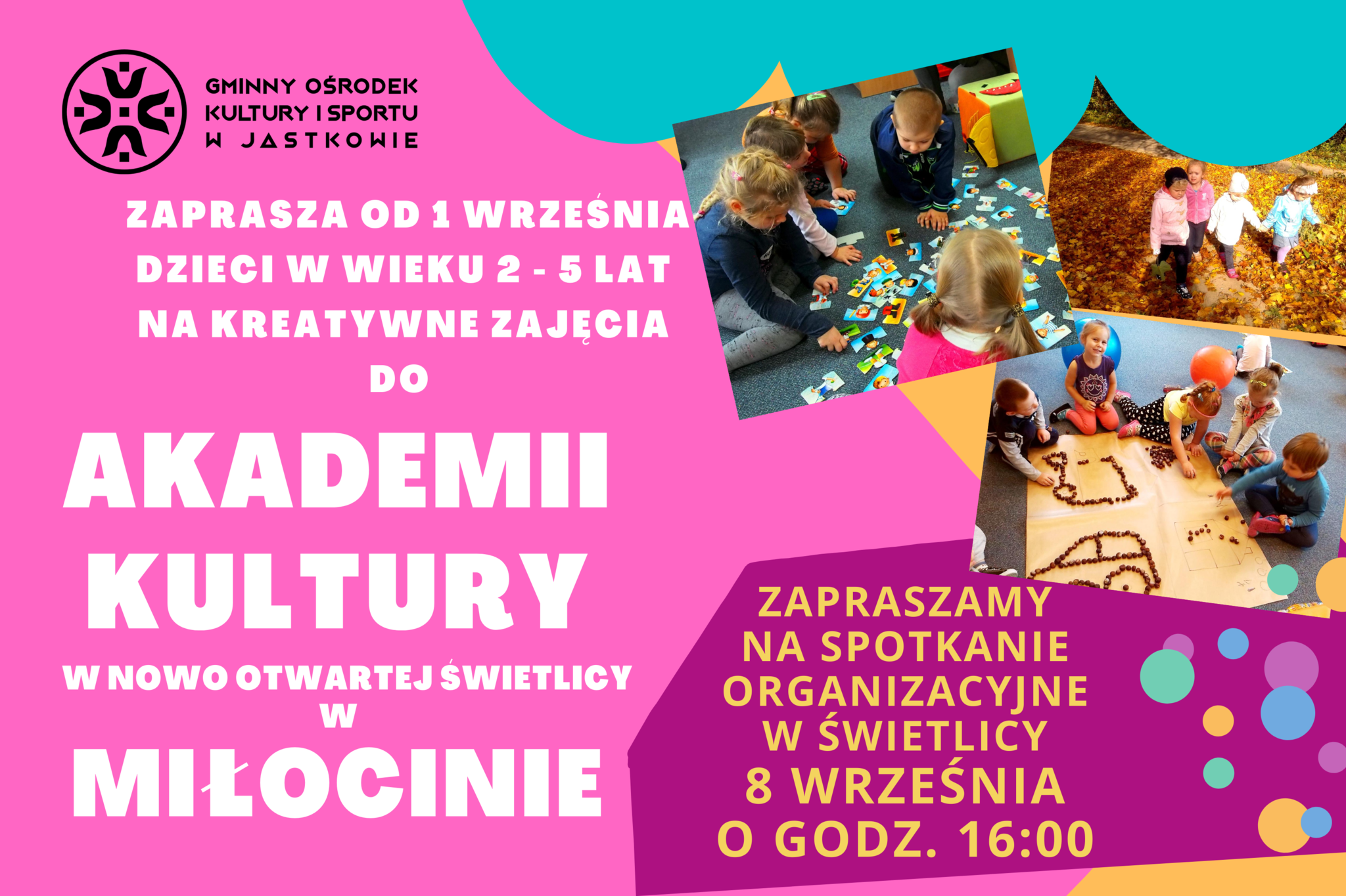 GMINNY OŚRODEK KULTURY I SPORTU ZAPRASZA SERDECZNIE DZIECI W WIEKU 2-5 LAT NA ZAJĘCIA W AKADEMIACH KULTURY NA TERENIE GMINY JASTKÓW.