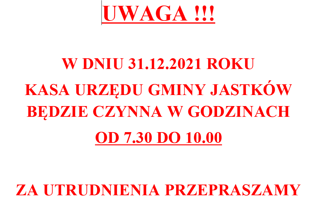 GODZINY PRACY KASY URZĘDU GMINY W DNIU 31.12.2021
