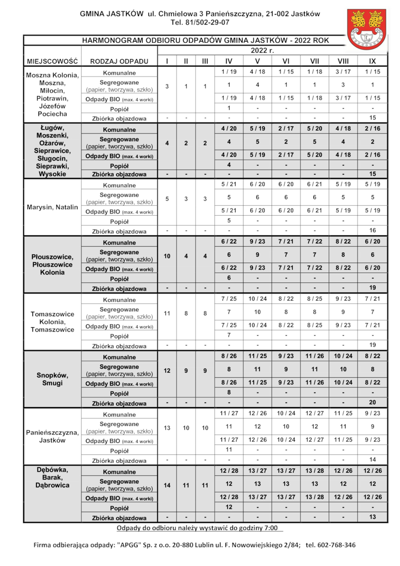 HARMONOGRAM ODBIORU ODPADÓW GMINA JASTKÓW NA 2022 ROK - ZABUDOWA JEDNORODZINNA