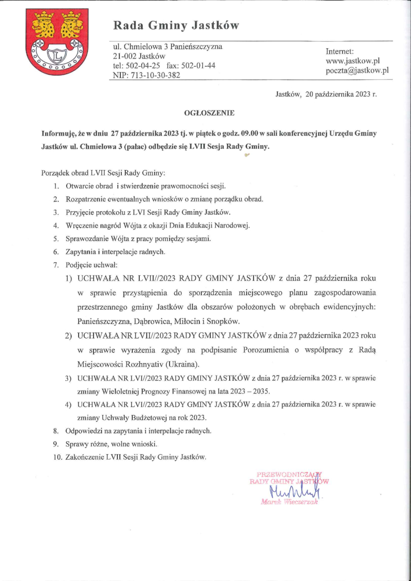 Informujemy, że dnia 27.10.2023 (piątek) o godzinie 9.00 w sali konferencyjnej Urzędu Gminy w Jastkowie ul Chmielowa 3 (pałac) odbędzie się LVII sesja Rady Gminy Jastków