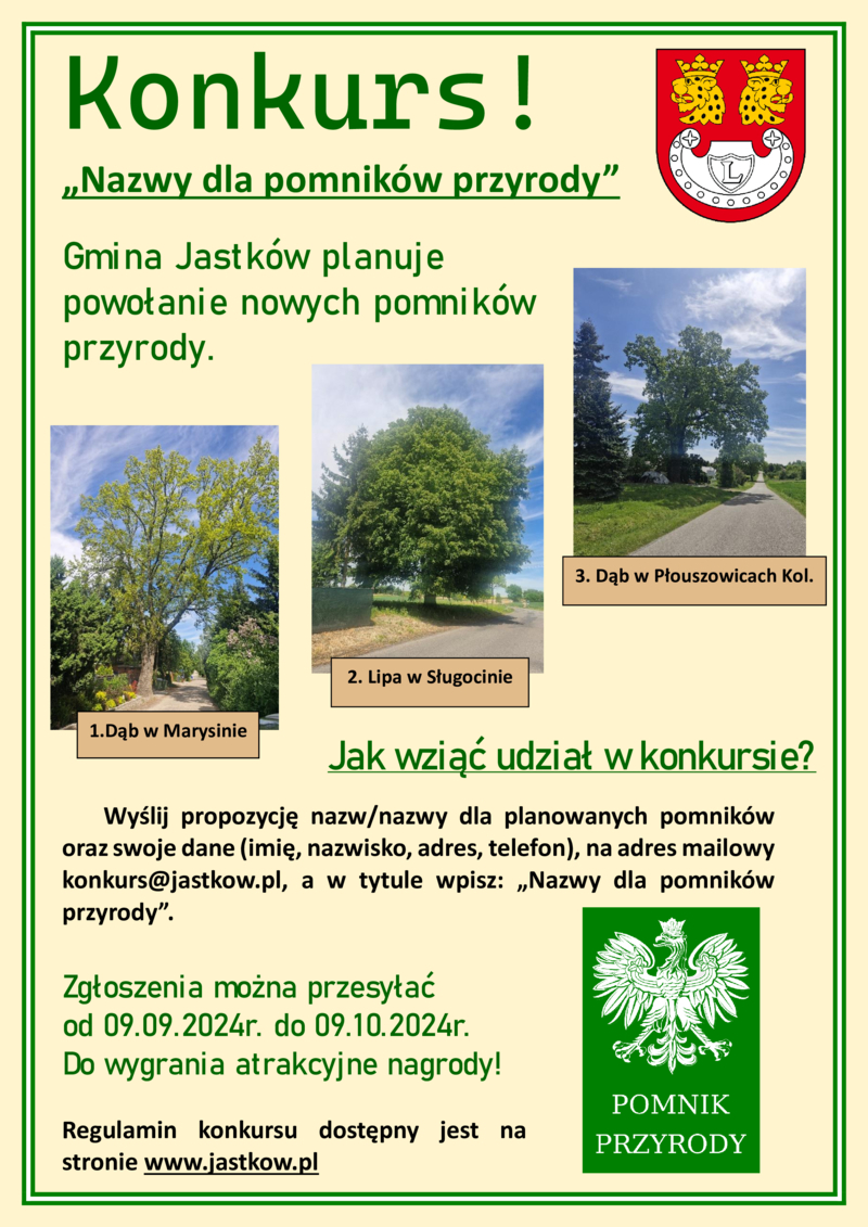 Wyślij propozycję nazw/nazwy dla planowanych pomników oraz swoje dane (imię, nazwisko, adres, telefon), na adres mailowy konkurs@jastkow.pl, a w tytule wpisz: „Nazwy dla pomników przyrody”.