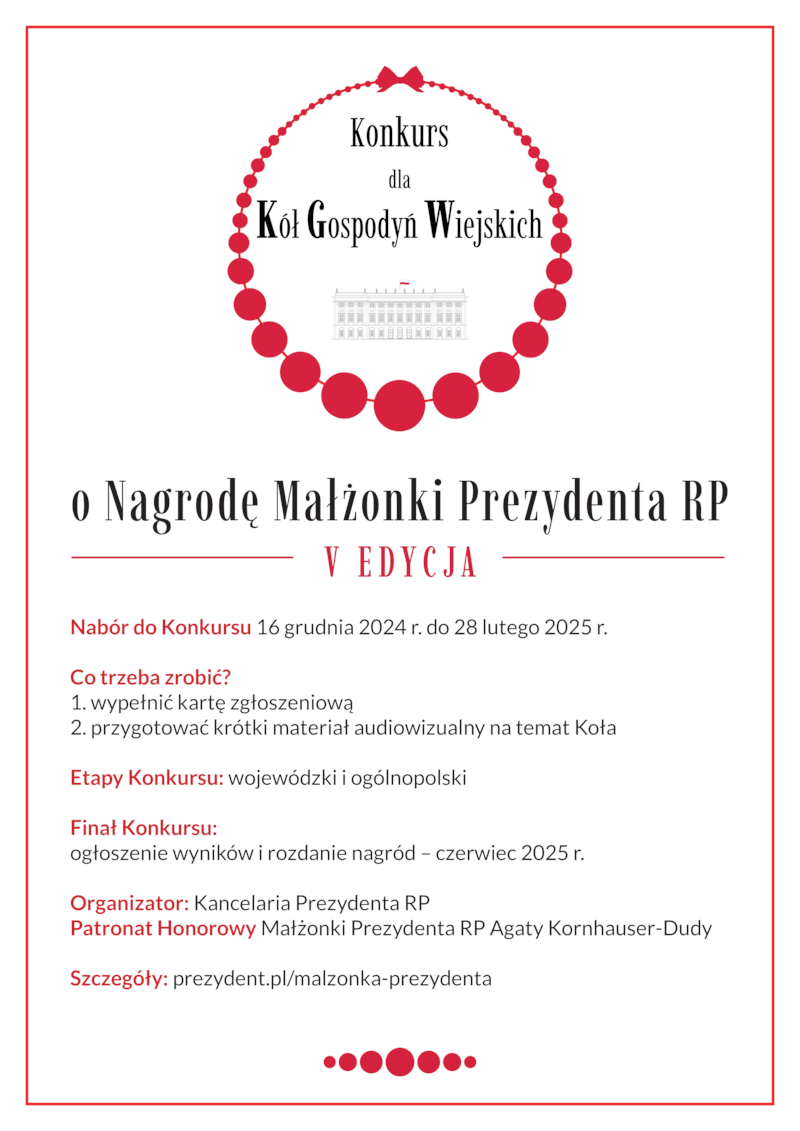 uprzejmie informujemy, że po raz piąty Kancelaria Prezydenta Rzeczypospolitej Polskiej jest organizatorem Konkursu dla Kół Gospodyń Wiejskich o Nagrodę Małżonki Prezydenta RP. Tematem przewodnim obecnej edycji będą Święta Bożego Narodzenia dawniej i dziś.