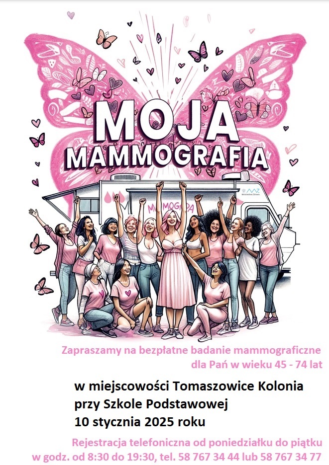 Zapraszamy na bezpłatne badanie mammograficzne dla Pań w wieku 45-74 lat, które odbędzie się 10 stycznia 2025r przy Szkole Podstawowej w Tomaszowicach Kolonii.