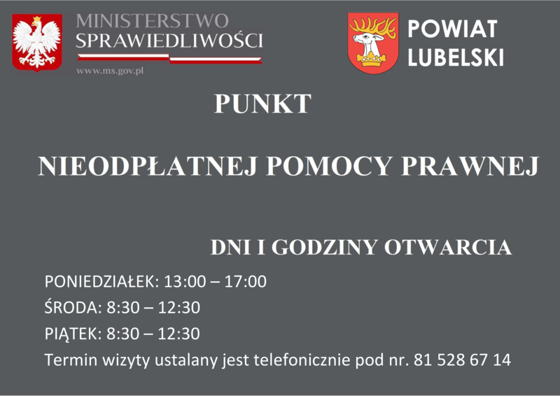 Termin porady ustalany jest telefonicznie pod nr (81) 52 86 714 lub e-mail: pomocprawna@powiat.lublin.pl Porady udzielane są wg kolejności zgłoszeń w każdej Gminie w Powiecie Lubelskim.