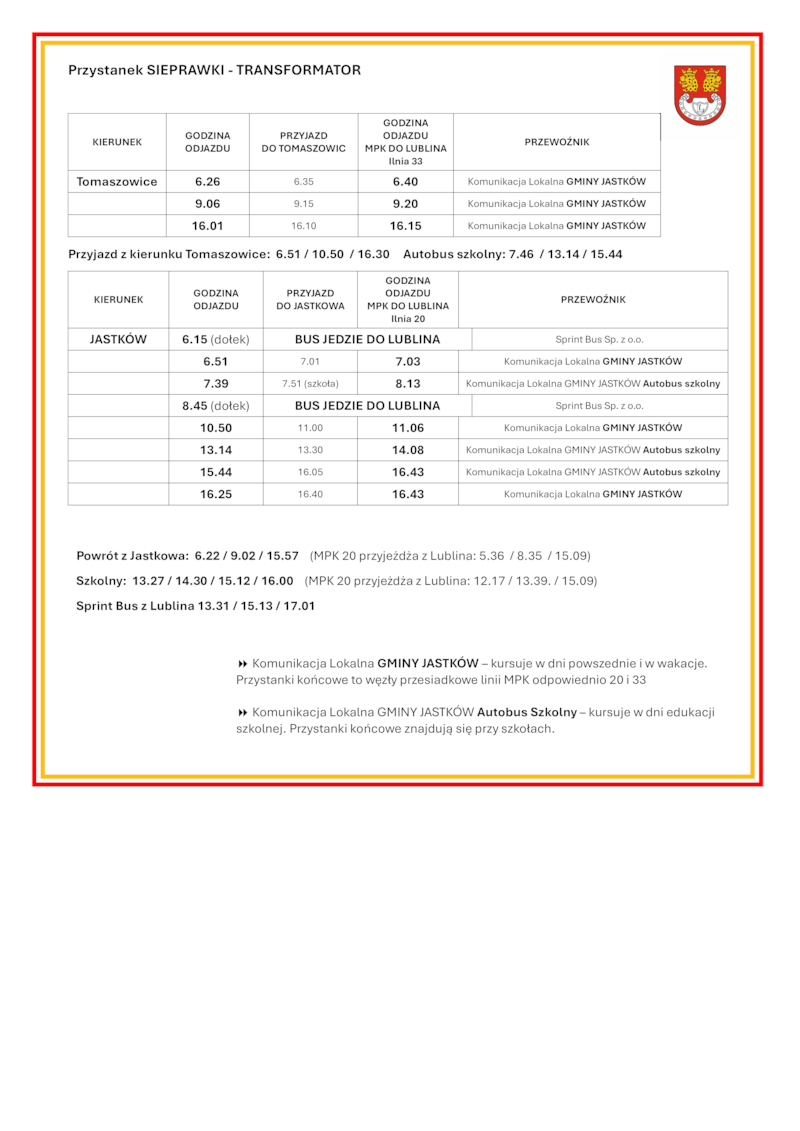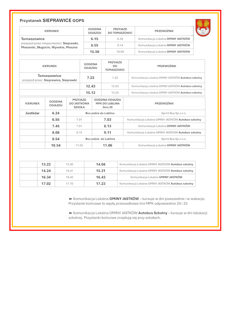 Informujemy, że z dniem 1 marca 2024 r. rusza pilotażowa linia komunikacyjna łącząca miejscowości Jastków, Sieprawice, Sieprawki, Moszenki, Sługocin, Wysokie, Moszna Kolonia, Moszna, Tomaszowice Kolonia.
