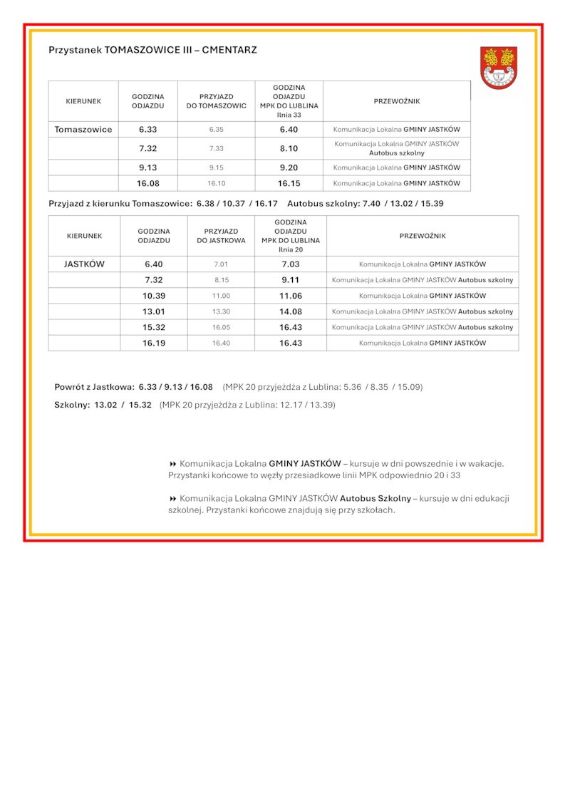 Kursy będą łączyć dwa węzły przesiadkowe zlokalizowane w miejscowości Tomaszowice Kolonia i Jastków (przy bibliotece). Stanowią kolejny etap rozwoju transportu zbiorowego w naszej gminie i mają na celu ułatwić osobom pracującym oraz młodzieży uczącej się przesiadkę do autobusów MPK i dojazd do wybranego miejsca w mieście wojewódzkim Lublin.