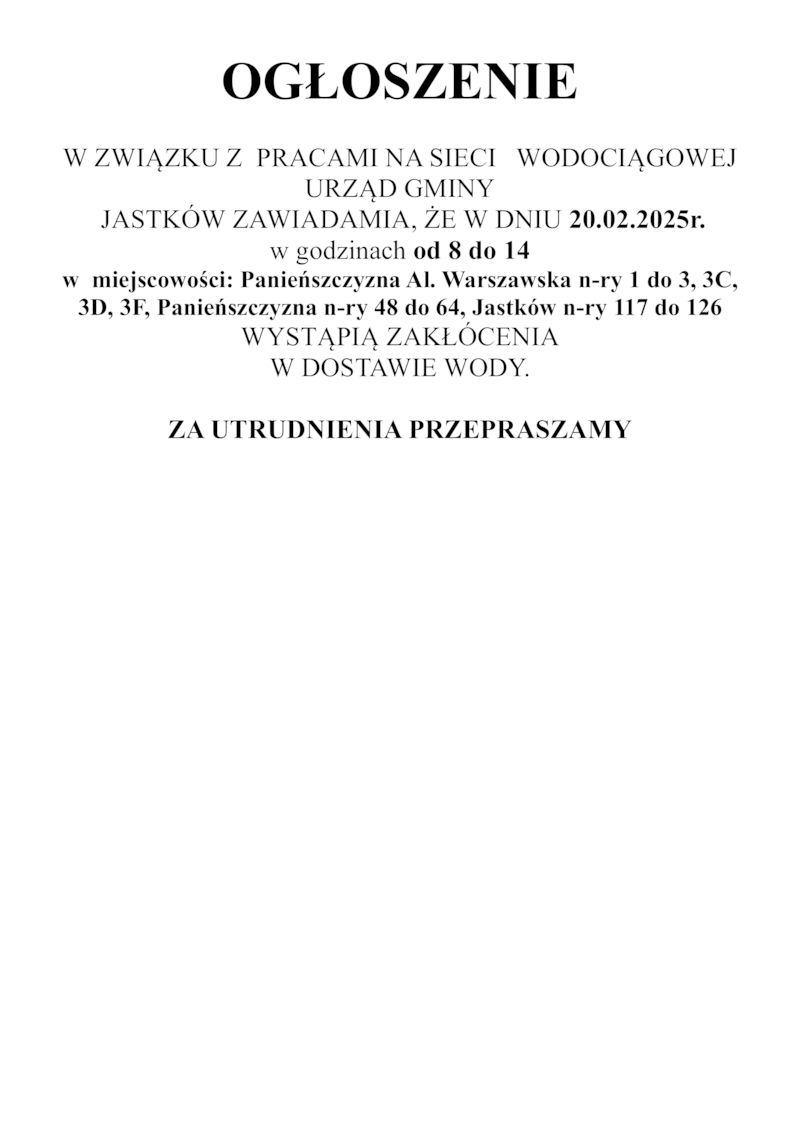 JASTKÓW ZAWIADAMIA, ŻE W DNIU 20.02.2025r.
