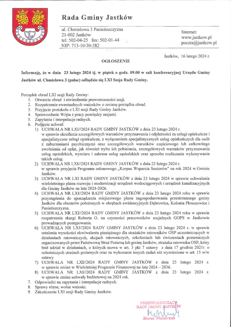OGŁOSZENIE LXI SESJA RADY GMINY JASTKÓW