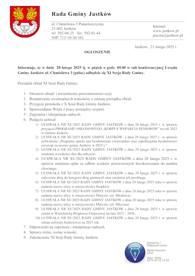 OGŁOSZENIE O XI SESJI RADY GMINY JASTKÓW