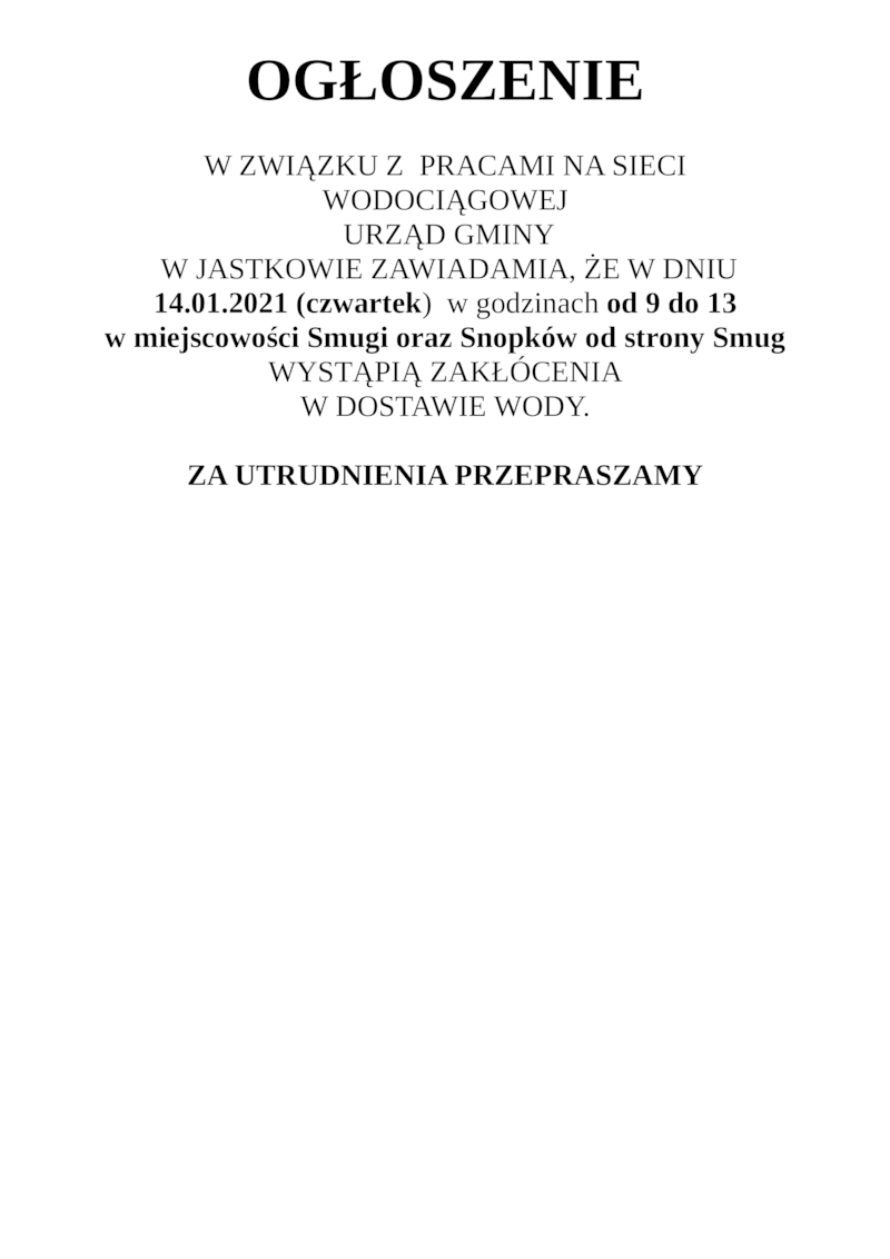 OGŁOSZENIE W SPRAWIE ZAKŁÓCEŃ W DOSTAWIE WODY W MIEJSCOWOŚCI SMUGI ORAZ SNOPKÓW OD STRONY SMUG W DNIU 14.01.2021