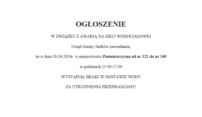 OGŁOSZENIE W ZWIĄZKU Z AWARIĄ NA SIECI WODOCIAGOWEJ URZĄD GMINY JASTKÓW ZAWIADAMIA, ŻE W DNIU 30.04.2024R. W MIEJSCOWOŚCI PANIEŃSZCZYZNA OD NR 121 DO NR 140 W GODZINACH 13:00-17:00 WYSTĄPIĄŁ BRAKI W DOSTAWIE WODY