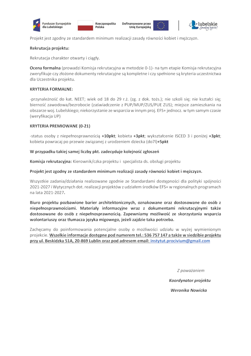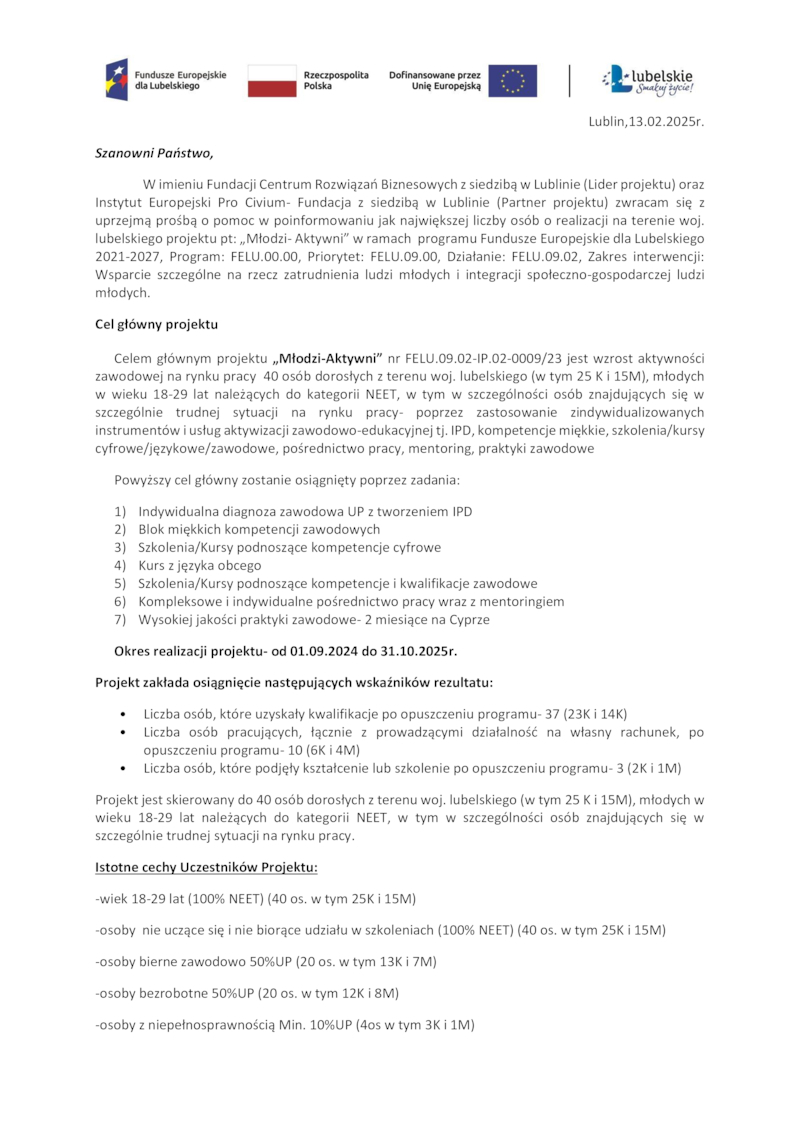 W imieniu Fundacji Centrum Rozwiązań Biznesowych z siedzibą w Lublinie (Lider projektu) oraz Instytut Europejski Pro Civium- Fundacja z siedzibą w Lublinie (Partner projektu) zwracam się z uprzejmą prośbą o pomoc w poinformowaniu jak największej liczby osób o realizacji na terenie woj. lubelskiego projektu pt: „Młodzi- Aktywni” w ramach programu Fundusze Europejskie dla Lubelskiego 2021-2027, Program: FELU.00.00, Priorytet: FELU.09.00, Działanie: FELU.09.02, Zakres interwencji: Wsparcie szczególne na rzecz zatrudnienia ludzi młodych i integracji społeczno-gospodarczej ludzi młodych.