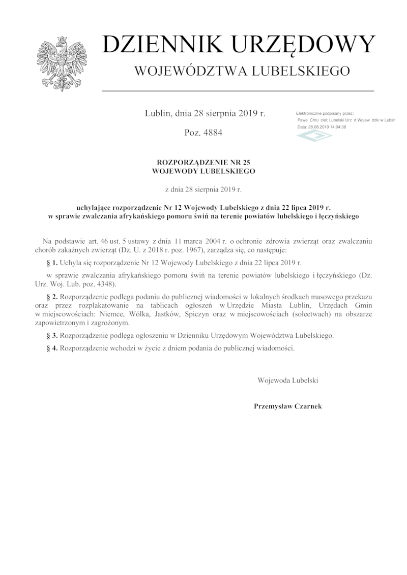 ROZPORZĄDZENIE NR 25 WOJEWODY LUBELSKIEGO Z DNIA 28 SIERPNIA 2019 R. UCHYLAJĄCE ROZPORZĄDZENIE NR 12 WOJEWODY LUBELSKIEGO Z DNIA 22 LIPCA 2019 R. W SPRAWIE ZWALCZANIA AFRYKAŃSKIEGO POMORU ŚWIŃ NA TERENIE POWIATÓW LUBELSKIEGO I ŁĘCZYŃSKIEGO