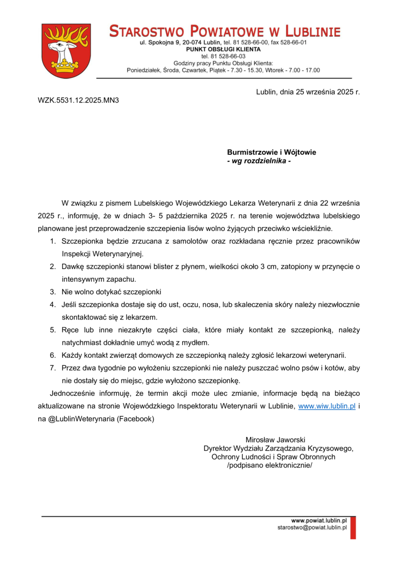 W związku z pismem Lubelskiego Wojewódzkiego Lekarza Weterynarii z dnia 22 września 2025 r., informuję, że w dniach 3- 5 października 2025 r. na terenie województwa lubelskiego planowane jest przeprowadzenie szczepienia lisów wolno żyjących przeciwko wściekliźnie.