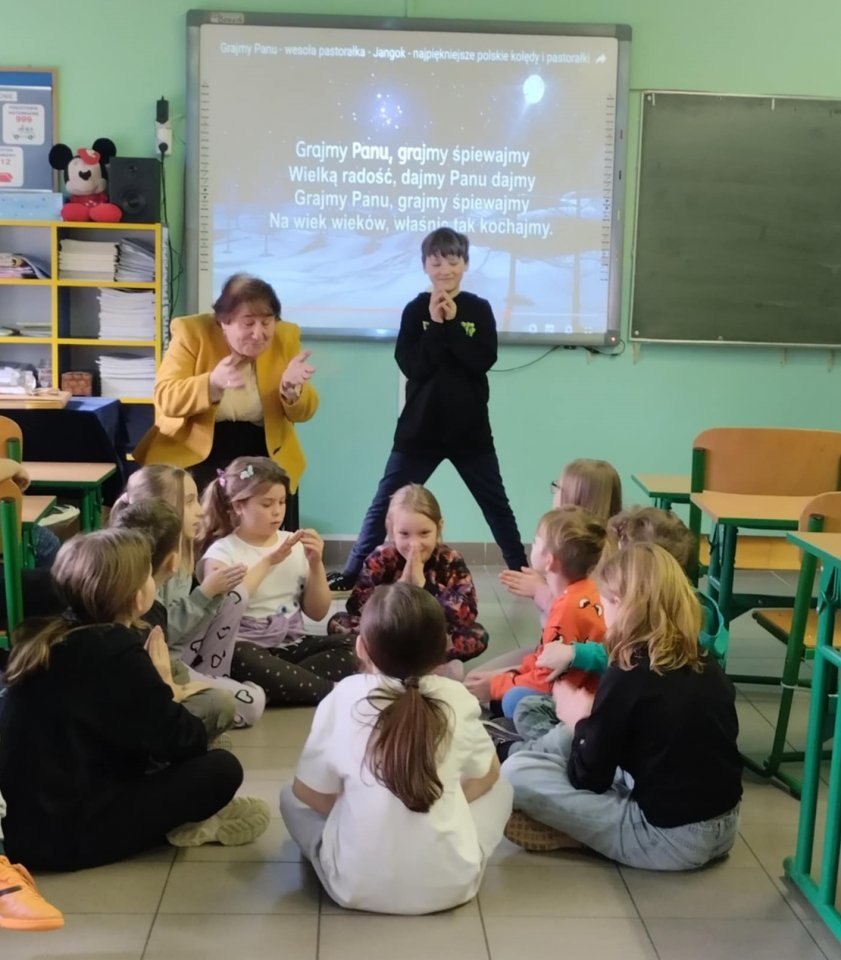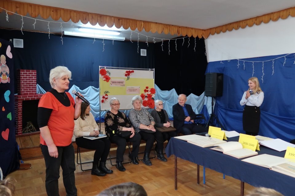 Seniorki opowiadały o swoich latach szkolnych, w tym między innymi o tym, jak trudna była dla nich droga do szkoły (zwłaszcza zimą, kiedy musiały pokonywać kilka kilometrów), jak niełatwo było uczyć się bez podręczników czy nawet zeszytów, ponieważ nie każdego było na to wówczas stać. Dużym zaskoczeniem dla naszych uczniów było to, że w szkole nie wydawano obiadów, a ich rówieśnicy z tamtych lat czasami mieli do jedzenia tylko kilka kromek. Pani Teresa opowiadała o historii powstania szkoły i o jej wyglądzie w czasach, gdy do niej uczęszczała. Także o tym, jak wyglądały wtedy akademie z okazji świąt patriotycznych i dlaczego uczniowie szkoły opiekują się Cmentarzem Legionistów.