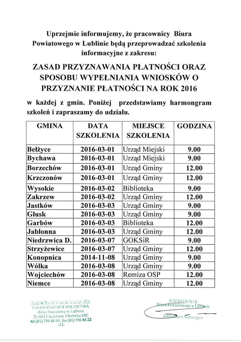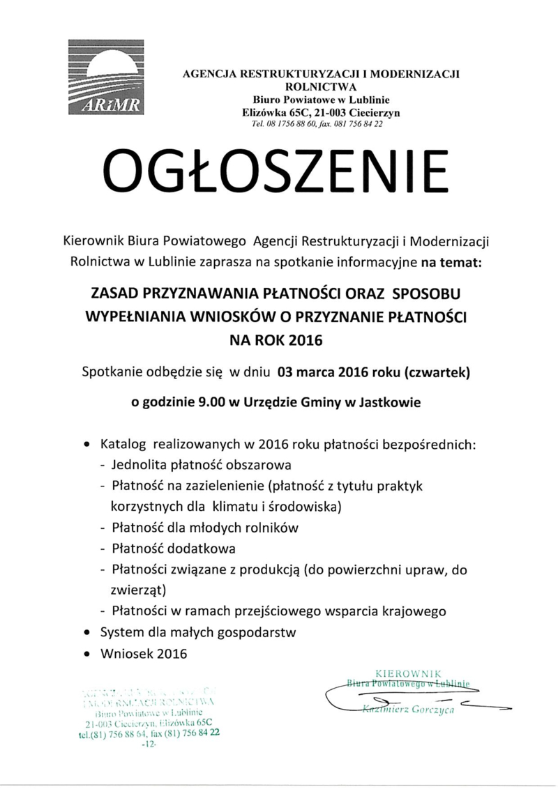 Informujemy, że ARiMR w Lublinie zaprasza na spotkanie informacyjne na temat zasad przyznawania płatności oraz sposobu wypełniania wniosków o przyznanie płatności na rok 2016. Szczegółowej informacje znajdują się w poniższych załącznikach.