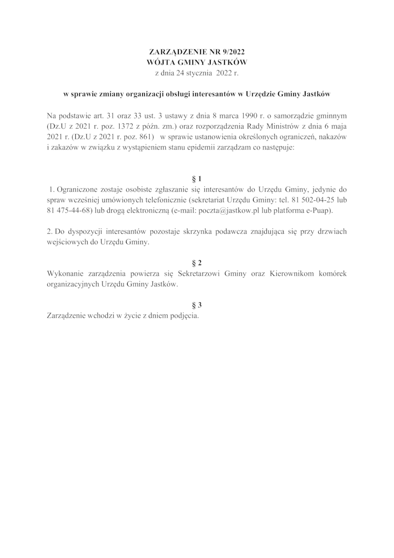 Szanowni Państwo, z uwagi na trudną sytuację związaną z utrzymującym się na terytorium Rzeczpospolitej Polskiej stanem epidemii informuję, że od 24 stycznia br. do odwołania - Urząd Gminy Jastków ogranicza bezpośrednią obsługę interesantów. Powyższe działania mają charakter prewencyjny.