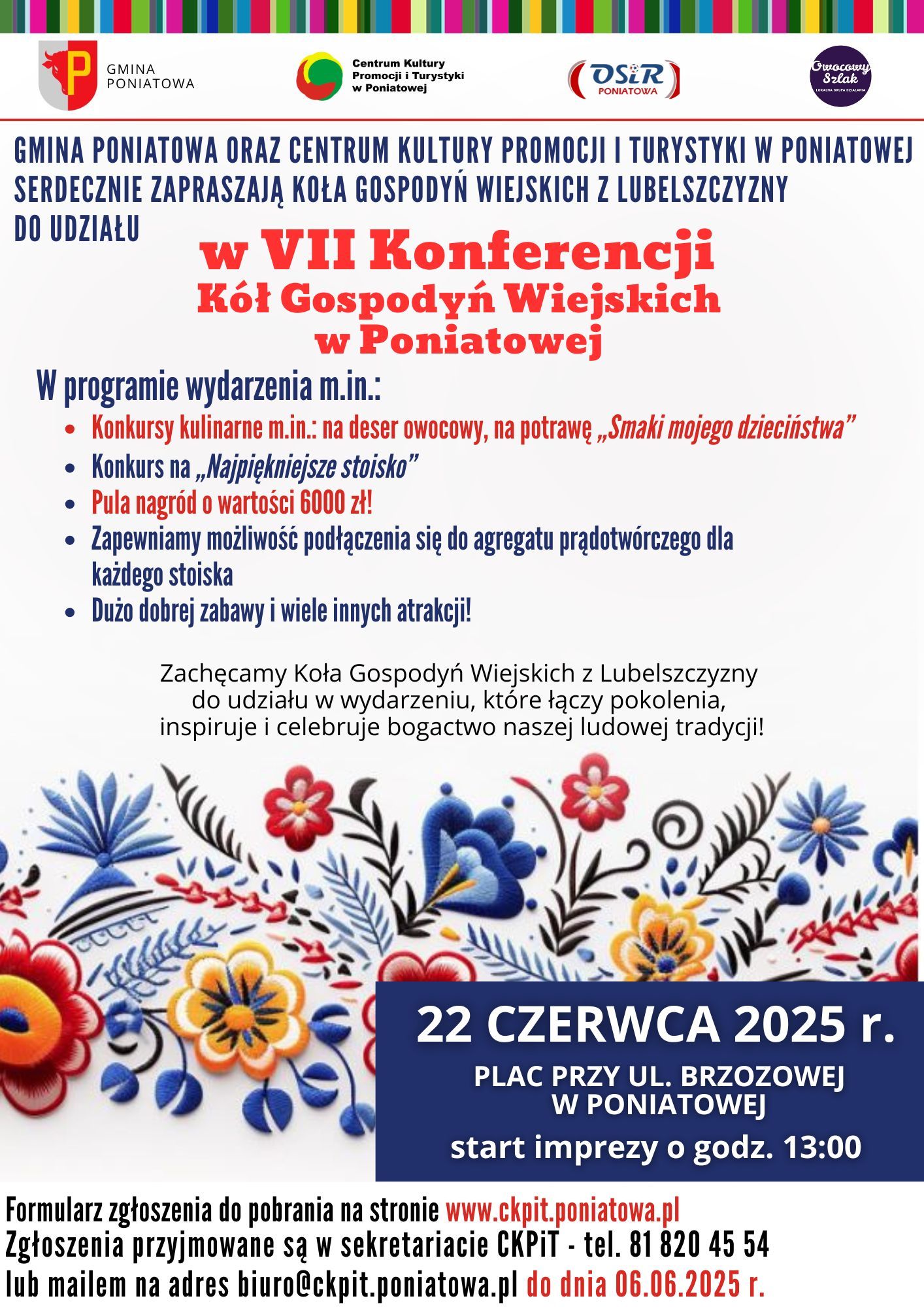 Gmina Poniatowa oraz Centrum Kultury Promocji i Turystyki w Poniatowej serdecznie zapraszają Koła Gospodyń Wiejskich z Lubelszczyzny do udziału w nadchodzącej VII Konferencji Kół Gospodyń Wiejskich, która odbędzie się 22 czerwca 2025 r. na placu przy ulicy Brzozowej w Poniatowej. Tego dnia czekać będą na Was konkursy kulinarne o różnorodnej tematyce, rywalizacja o tytuł ,,Najpiękniejszego stoiska'' oraz mnóstwo atrakcyjnych nagród do wygrania! Wydarzenie, pełne folkloru i tradycji uświetnią występy lokalnych artystów oraz koncert gwiazdy wieczoru.