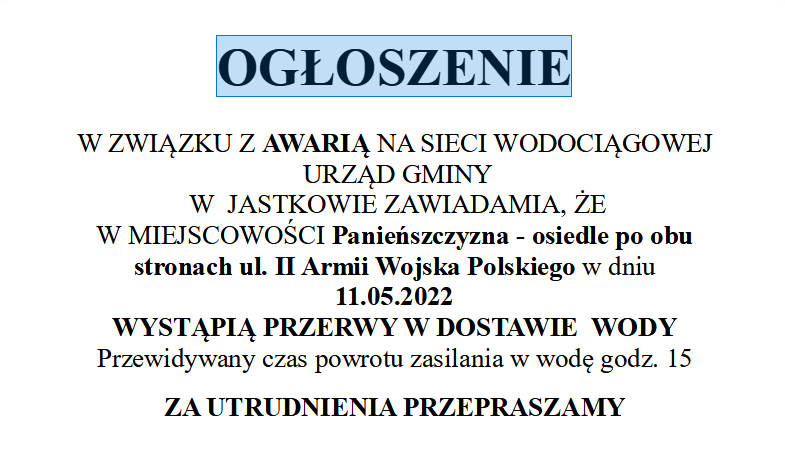AKTUALIZACJA: W ZWIĄZKU Z AWARIĄ NA SIECI WODOCIĄGOWEJ URZĄD GMINY W JASTKOWIE ZAWIADAMIA, ŻE W MIEJSCOWOŚCI PANIEŃSZCZYZNA - OSIEDLE PO OBU STRONACH UL. II ARMII WOJSKA POLSKIEGO W DNIU 11.05.2022 WYSTĄPIĄ PRZERWY W DOSTAWIE WODY