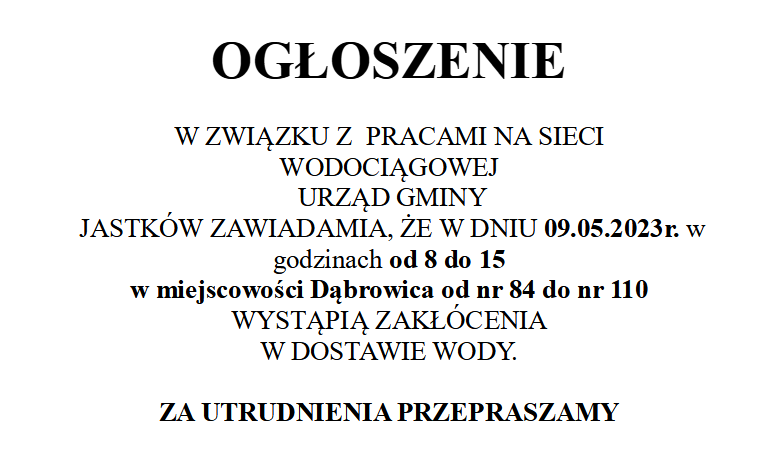 W ZWIĄZKU Z PRACAMI NA SIECI WODOCIĄGOWEJ URZĄD GMINY JASTKÓW ZAWIADAMIA, ŻE W DNIU 09.05.2023R. W GODZINACH OD 8 DO 15 W MIEJSCOWOŚCI DĄBROWICA OD NR 84 DO NR 110 WYSTĄPIĄ ZAKŁÓCENIA W DOSTAWIE WODY.