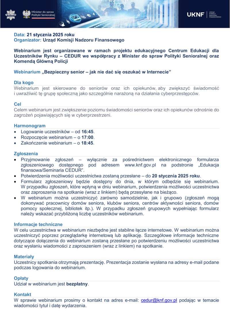 w ramach projektu Centrum Edukacji dla Uczestników Rynku – CEDUR, we współpracy z Minister ds. Polityki Senioralnej oraz Komendą Główną Policji.