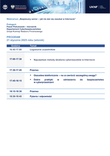 Celem webinarium jest zwiększenie poziomu świadomości seniorów oraz ich opiekunów odnośnie do zagrożeń pojawiających się w cyberprzestrzeni.