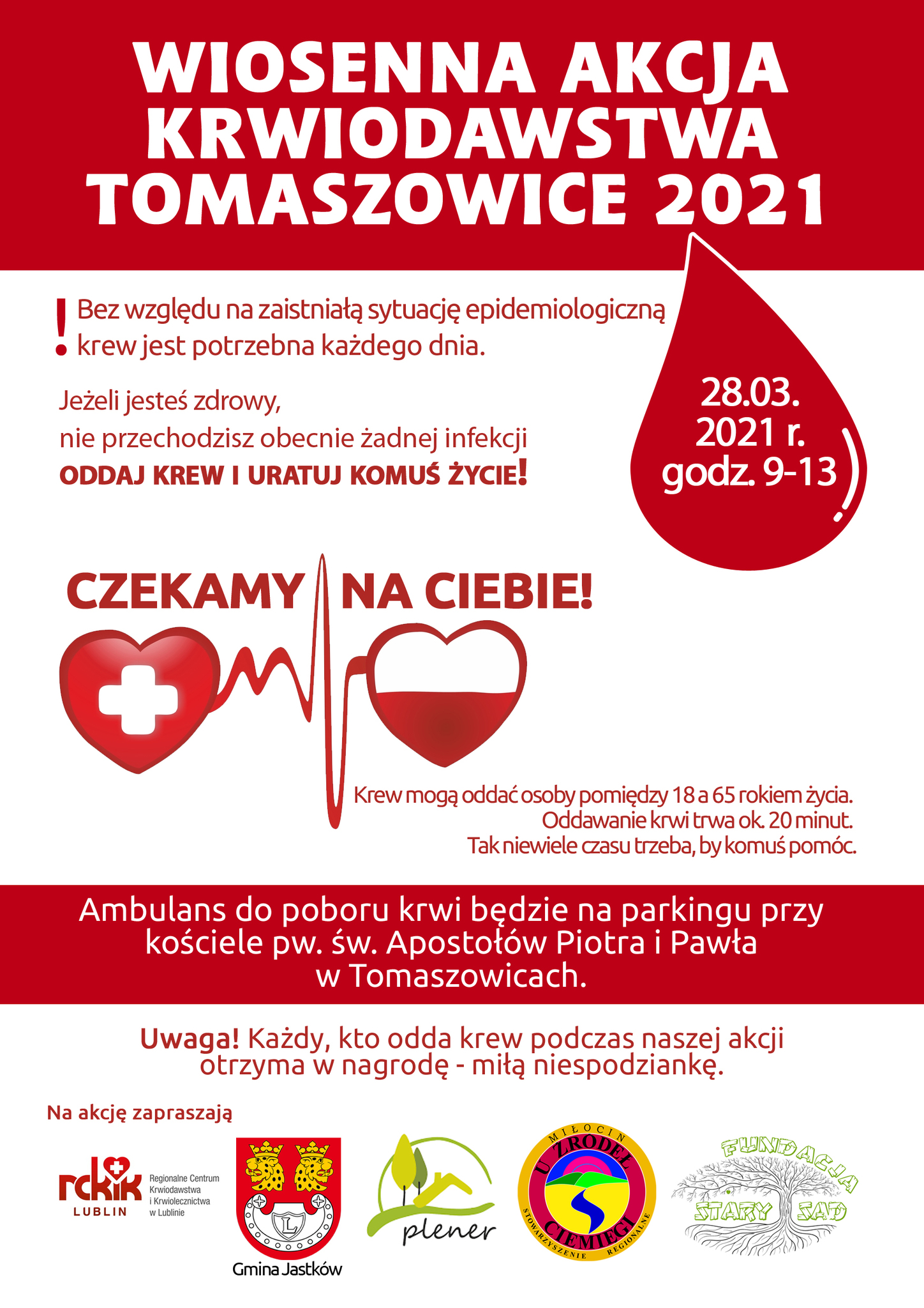 W najbliższą niedzielę, 28 marca 2021 r., w godz. 9-13, na terenie parafii w Tomaszowicach, wzorem ubiegłych lat, będzie organizowana akcja krwiodawstwa. Ambulans do poboru krwi stanie na parkingu przy kościele. Krew mogą oddać osoby zdrowe, pomiędzy 18 a 65 rokiem życia. Do rejestracji konieczne jest posiadanie dokumentu tożsamości. Krew jest lekiem, którego nie można wyprodukować, dlatego serdecznie zachęcam wszystkich, którzy mogą, do podzielenia się darem życia z drugim człowiekiem.