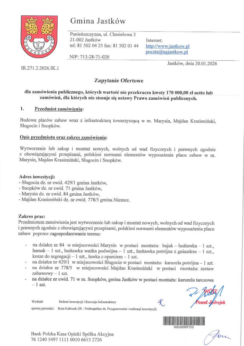 WYKONANIE PLACÓW ZABAW W MIEJSCOWOŚCIACH MARYSIN, SŁUGOCIN, SNOPKÓW, MAJDAN KRASIENIŃSKI