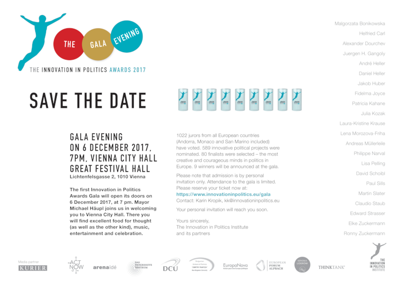 Konkurs „Innowacje w Polityce” jest organizowany przez Instytut Innowacji w Polityce z siedzibą w Wiedniu. W ramach konkursu wyróżniani są politycy odpowiedzialni za realizację projektów, które wnoszą nowe rozwiązania w dziewięciu kategoriach: Społeczeństwo, Demokracja, Prawa Człowieka, Wolność, Ekologia, Społeczność Lokalna, Miejsca Pracy, Dobrobyt i Jakość Życia.