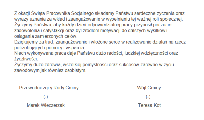 Z OKAZJI ŚWIĘTA PRACOWNIKA SOCJALNEGO SKŁADAMY PAŃSTWU SERDECZNE ŻYCZENIA ORAZ WYRAZY UZNANIA ZA WKŁAD I ZAANGAŻOWANIE W WYPEŁNIANIU TEJ WAŻNEJ ROLI SPOŁECZNEJ.