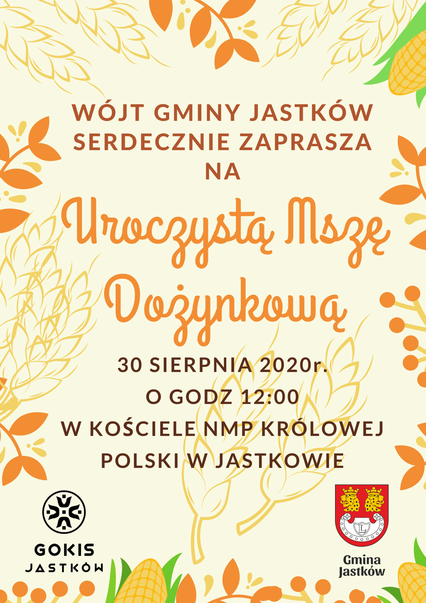 ZAPRASZAMY MIESZKAŃCÓW GMINY JASTKÓW NA UROCZYSTĄ MSZĘ DOŻYNKOWĄ.