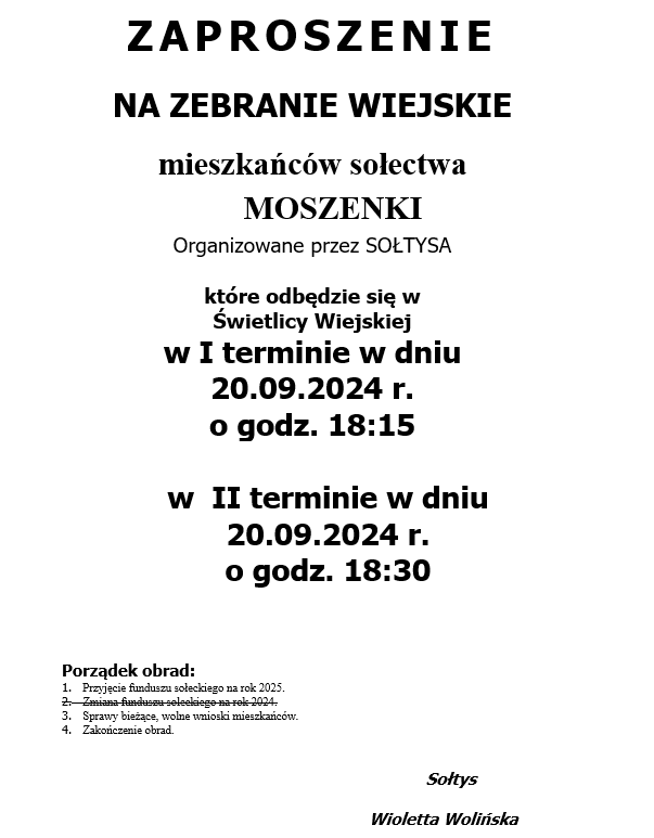 ZAPROSZENIE NA ZEBRANIE WIEJSKIE MIESZKAŃCÓW SOŁECTWA MOSZENKI ORGANIZOWANE PRZEZ SOŁTYSA