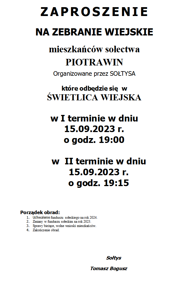 ZAPROSZENIE NA ZEBRANIE WIEJSKIE MIESZKAŃCÓW SOŁECTWA PIOTRAWIN ORGANIZOWANE PRZEZ SOŁTYSA KTÓRE ODBĘDZIE SIĘ W ŚWIETLICA WIEJSKA