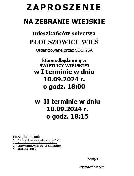 ZAPROSZENIE NA ZEBRANIE WIEJSKIE MIESZKAŃCÓW SOŁECTWA PŁOUSZOWICE WIEŚ ORGANIZOWANE PRZEZ SOŁTYSA