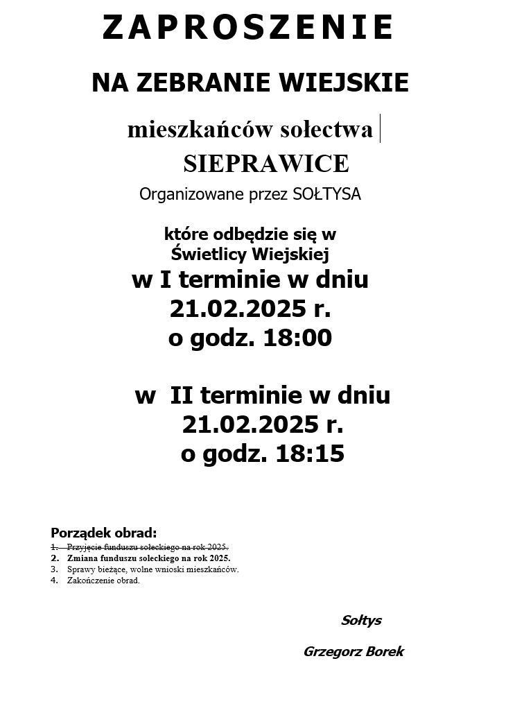 ZAPROSZENIE NA ZEBRANIE WIEJSKIE MIESZKAŃCÓW SOŁECTWA SIEPRAWICE ORGANIZOWANE PRZEZ SOŁTYSA