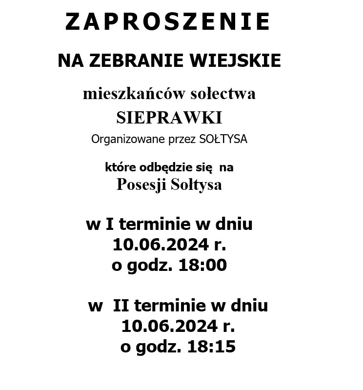 ZAPROSZENIE NA ZEBRANIE WIEJSKIE MIESZKAŃCÓW SOŁECTWA SIEPRAWKI ORGANIZOWANE PRZEZ SOŁTYSA
