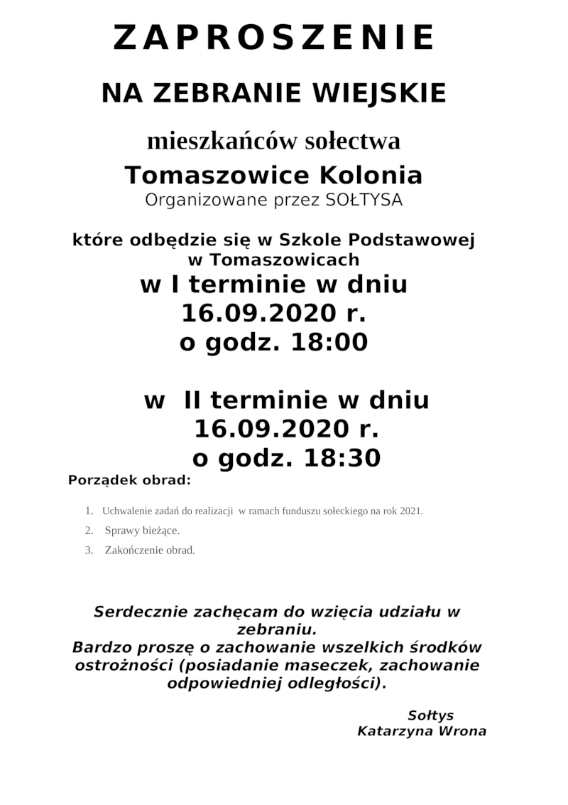 ZAPROSZENIE NA ZEBRANIE WIEJSKIE MIESZKAŃCÓW SOŁECTWA TOMASZOWICE KOLONIA