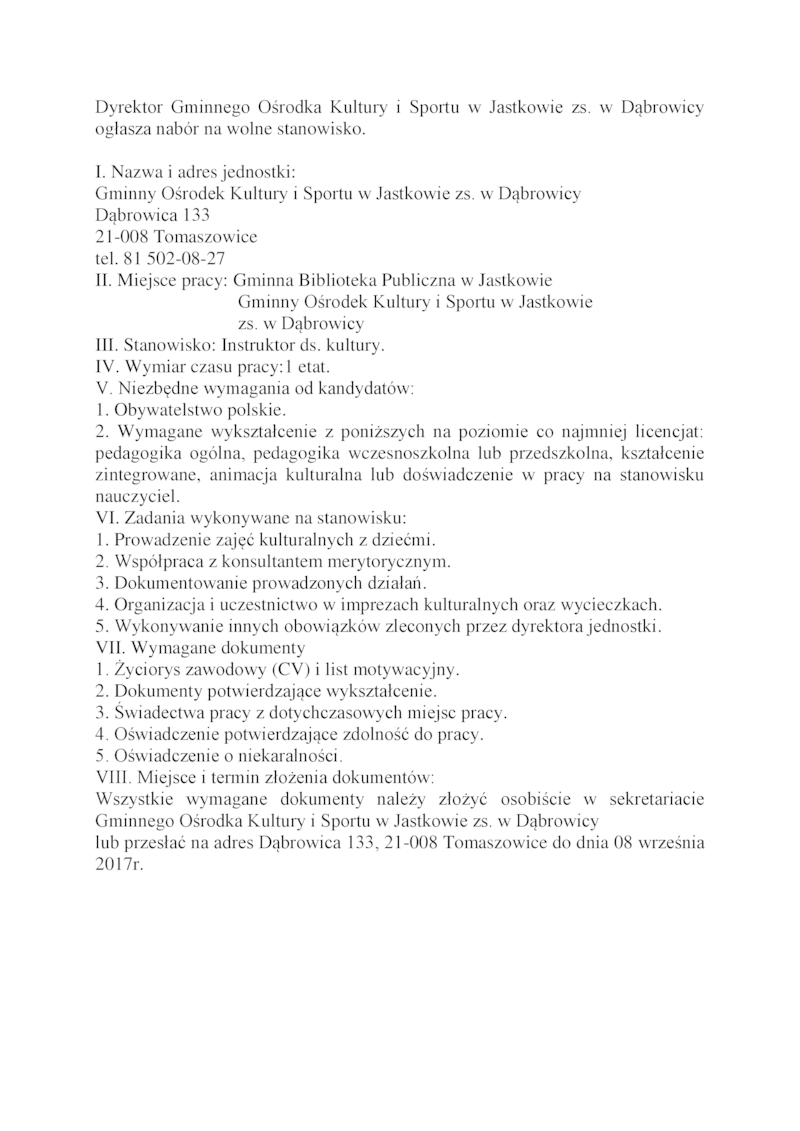 DYREKTOR GMINNEGO OŚRODKA KULTURY I SPORTU W JASTKOWIE ZS. W DĄBROWICY OGŁASZA NABÓR NA WOLNE STANOWISKO - INSTRUKTOR DS. KULTURY