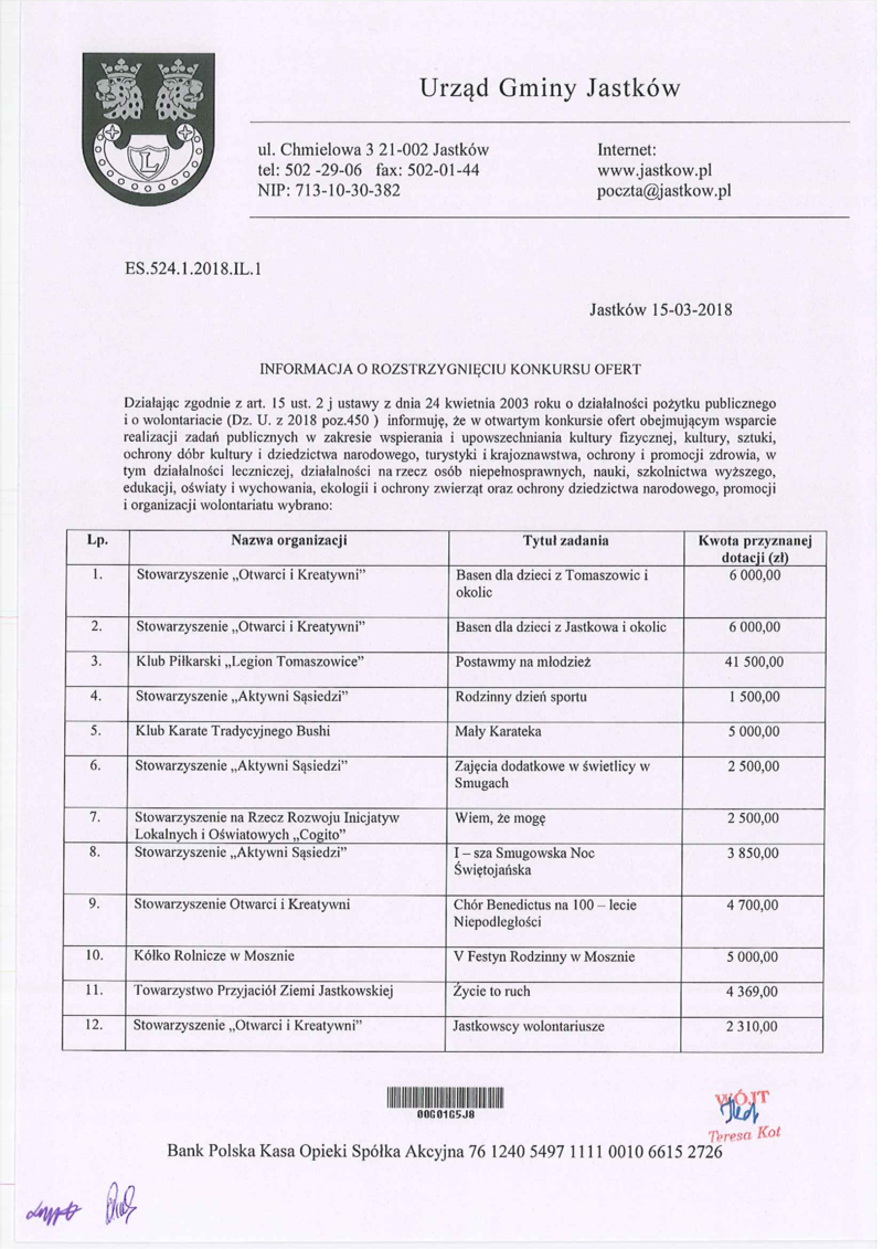 INFORMACJA O ROZSTRZYGNIĘCIU KONKURSU OFERT