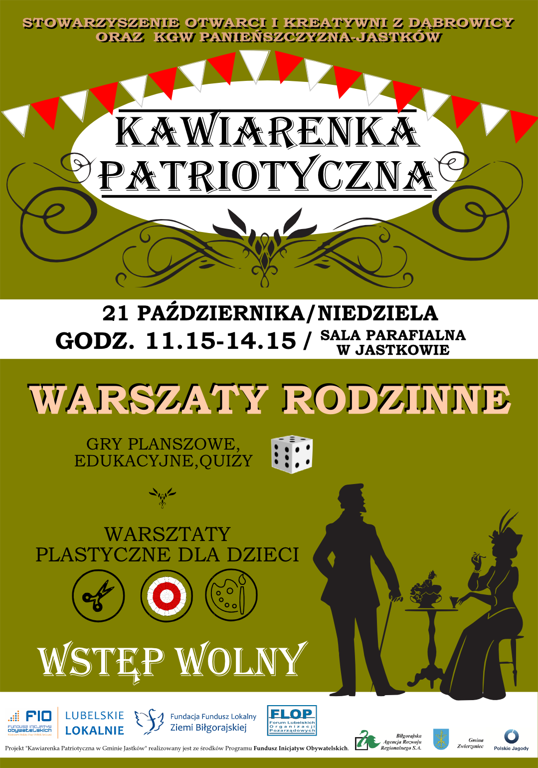 Zapraszamy na warsztaty rodzinne organizowane w ramach projektu "Kawiarenka Patriotyczna w Gminie Jastków". Podczas spotkania  dzieci z pomocą rodziców wezmą udział w  warsztatach plastycznych oraz grach planszowych. Wspólnie będzie można wykonać różnego rodzaju dekoracje w barwach narodowych (lampiony, breloczki, wianuszki...). Wstęp na wydarzenie jest bezpłatny!