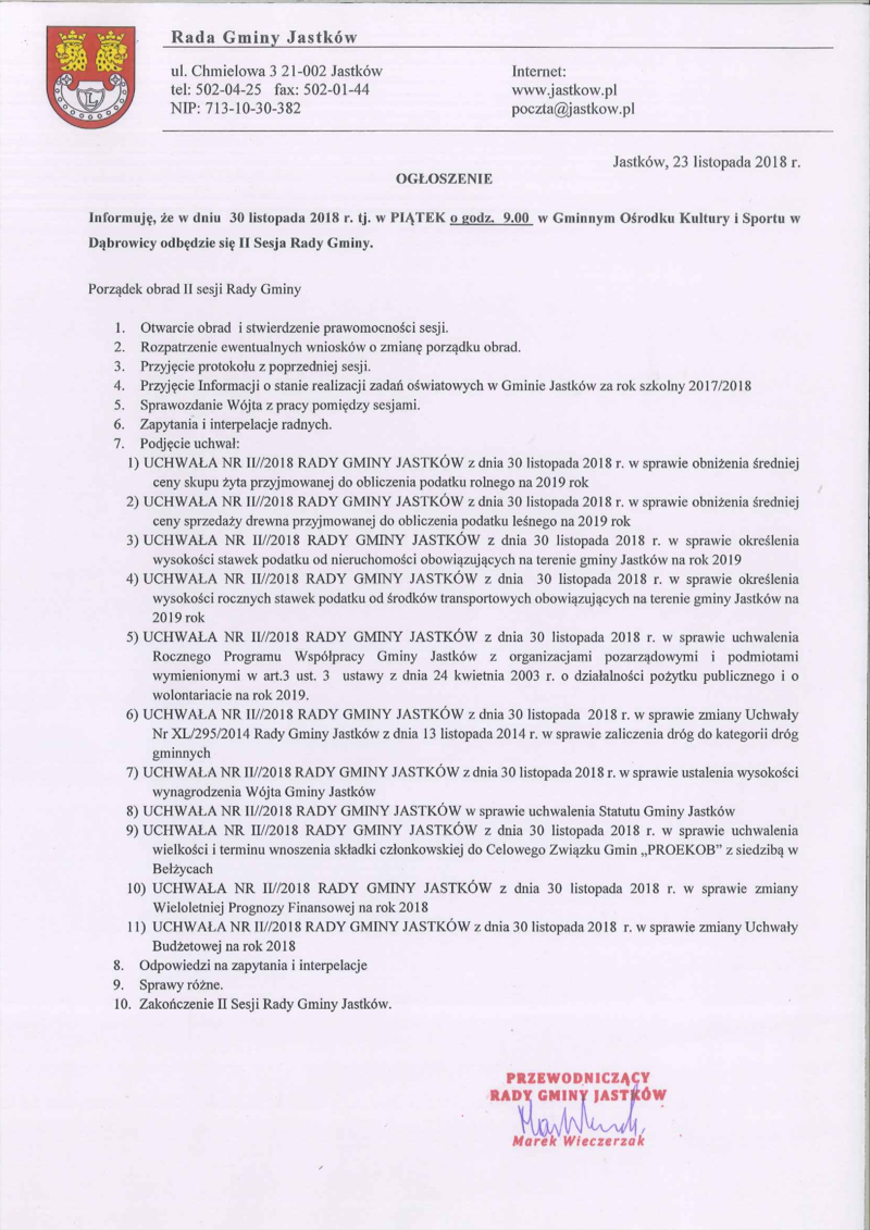 OGŁOSZENIE O II SESJI RADY GMINY JASTKÓW